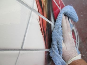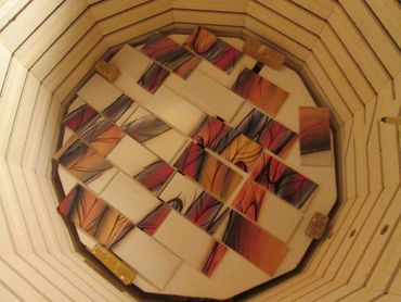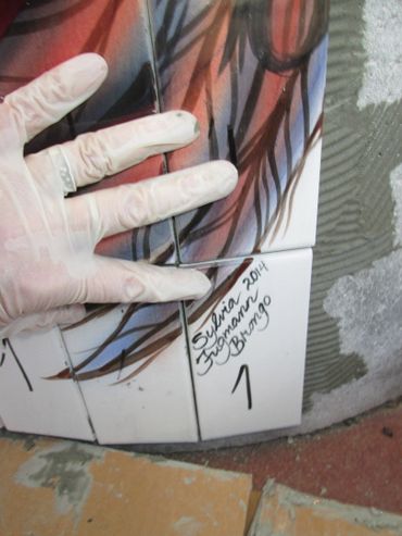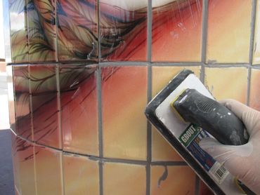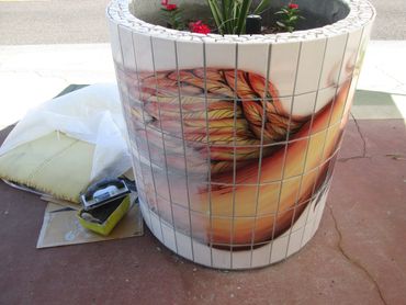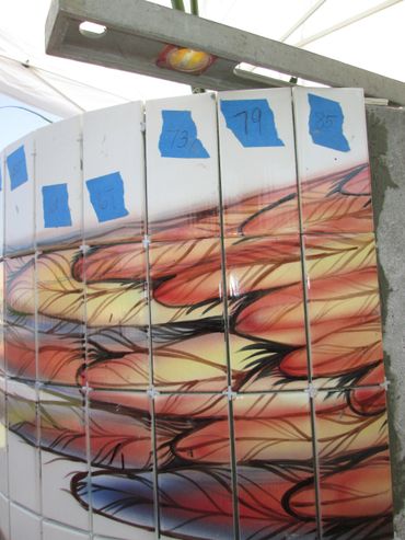 I created a commissioned mural for the arts district at Grand Avenue in Phoenix, Arizona. It sits at the roadway at 925 Grand Avenue. The design was airbrushed on over 120 commerical tiles, fired to 1850 degrees. The 3" x 6" tiles were cemented and grouted onto a concrete planter, and is one of several that can be found in this area. The design represents the Phoenix bird rising, holding the mitsudomoe, which is a Japanese symbol of the harmony between man, earth and sky.