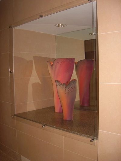 These vessels can be found in the lobby at Banner Thunderbird Medical Center in Glendale, Arizona. These two large ceramic pieces grace the welcome area with the hope that a calming, and peaceful visit towards wellness meets each and every visitor. The soft airbrushed tones, along with simple and graceful forms are meant to characterize the traditional purposes of a vessel, as a means to hold items that are practical, as well as perceived.